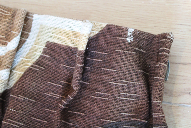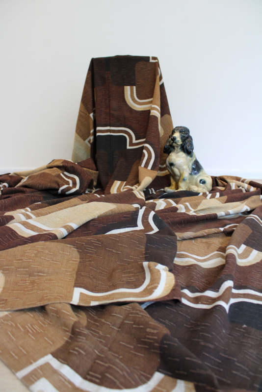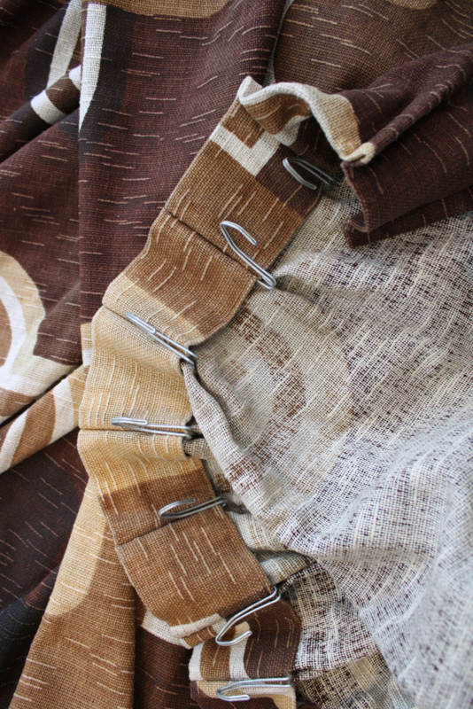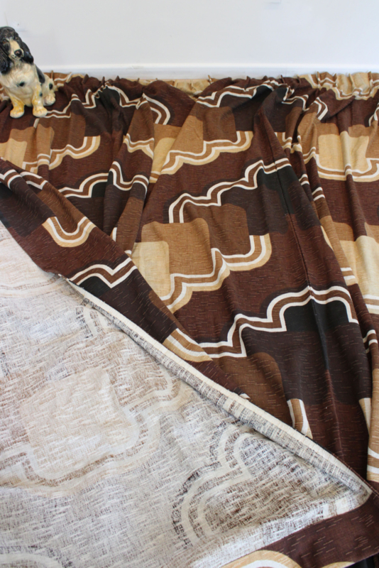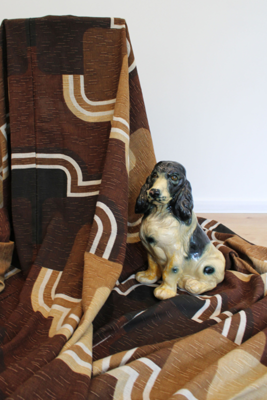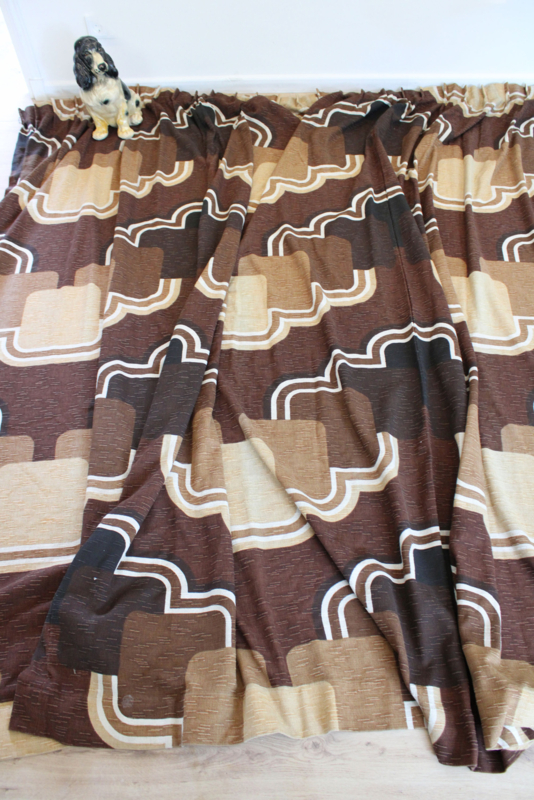 Supergroot vintage gordijn, vermoedelijk uit de jaren 70 van de vorige eeuw. De stof heeft een heerlijk seventies patroon in bruin tinten.