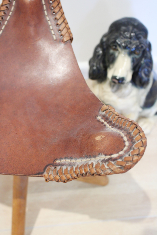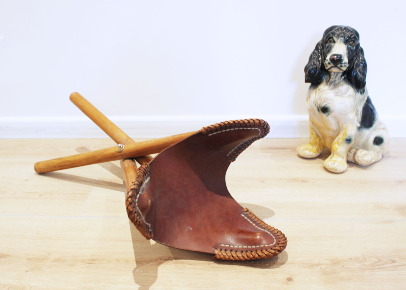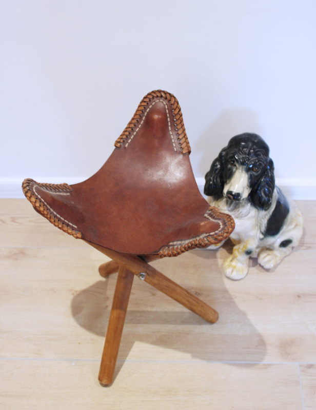 Houten vintage driepoot krukje met lederen zitting. Deze kruk is opvouwbaar en hierdoor gemakkelijk mee te nemen.