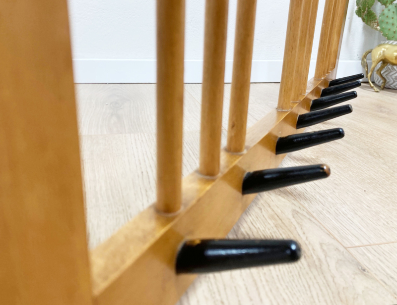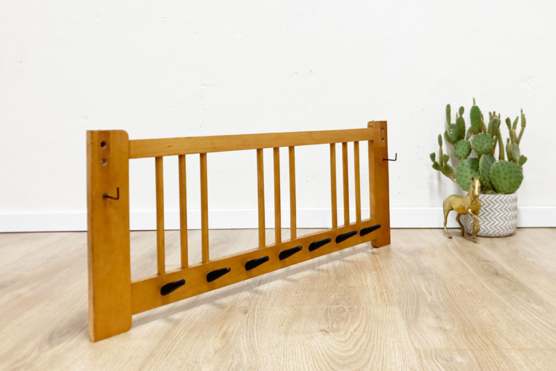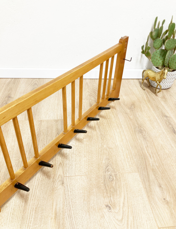 Vintage wandkapstok met zwarte haken. Houten retro kapstok