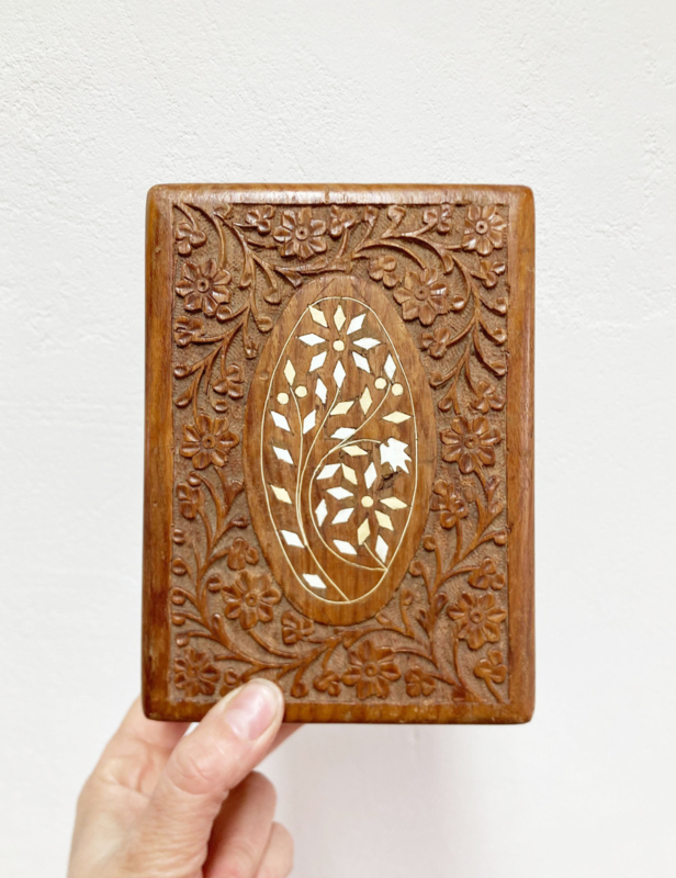 Prachtig vintage kistje met houtsnijwerk, perfect om je mooiste juwelen in op te bergen.