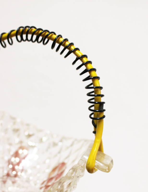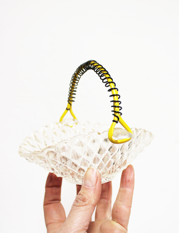 Dit retro bakje heeft een en metalen houder met geel draard. Het is ezien de leeftijd in mooie staat, een piepklein chipje aan de rand, zie foto's.