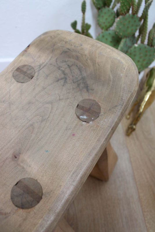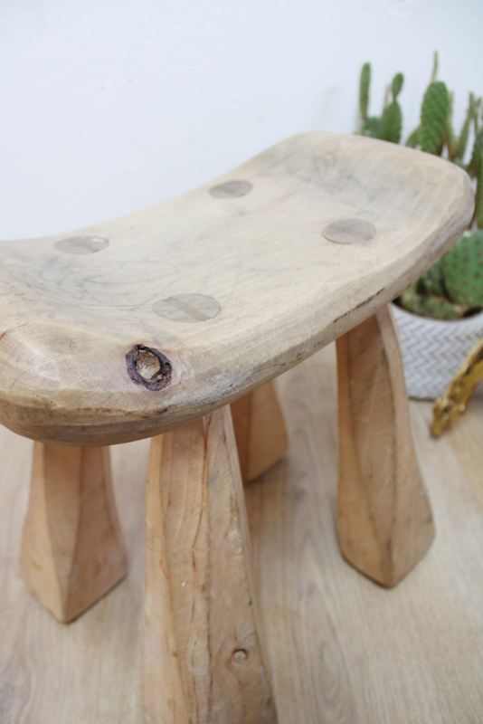 Laag houten krukje in Brutalist stijl. Massieve retro kruk / stool