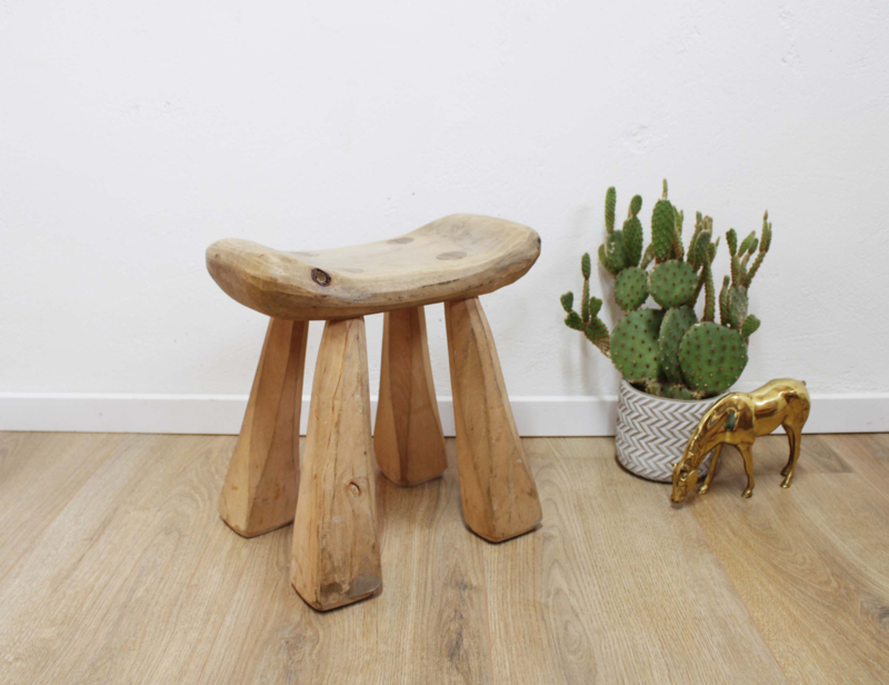 Dit originele krukje is zo te zien met de hand gemaakt en heeft wat normale gebruikssporen. Er zit een wiebeltje in een poot maar hij is nog erg stevig en is getest door een volwassene. Hoe oud het is of waar het vandaan komt weten we helaas niet.