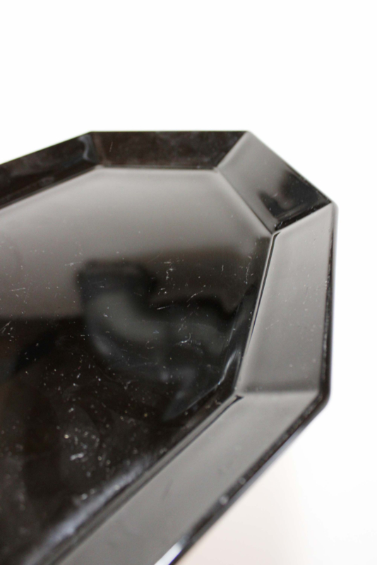Dit achthoekige retro bord is gemaakt van zwart glas en is een stijlicoon uit de jaren 80.