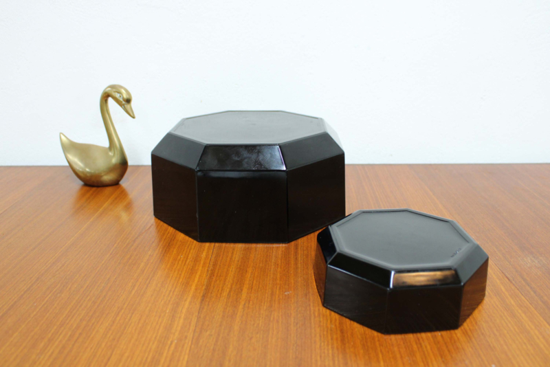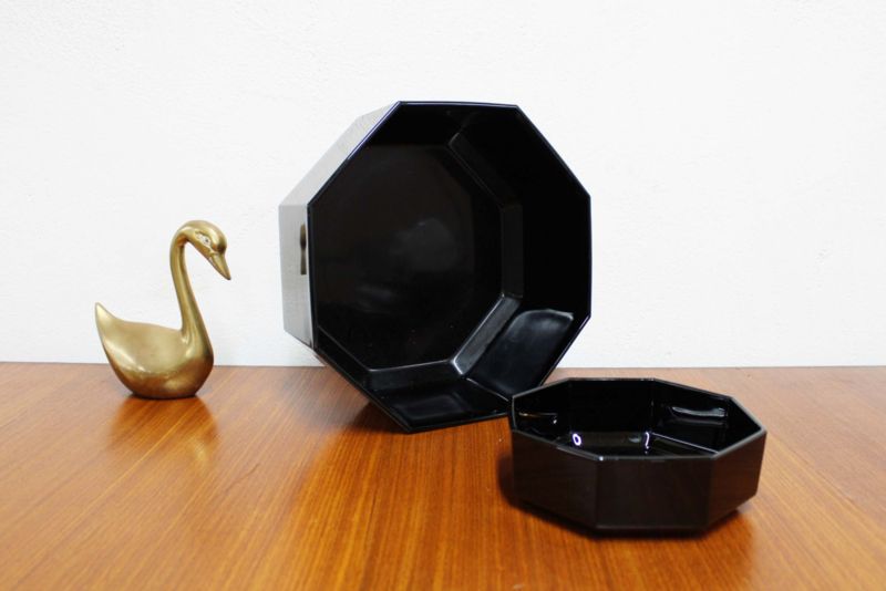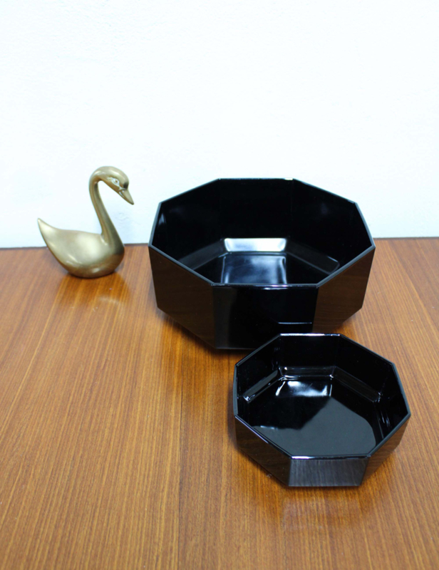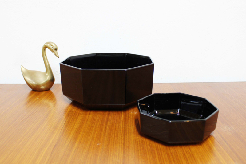 Deze achthoekige retro schaaltjes zijn gemaakt van zwart glas en zijn een stijlicoon uit de jaren 80.