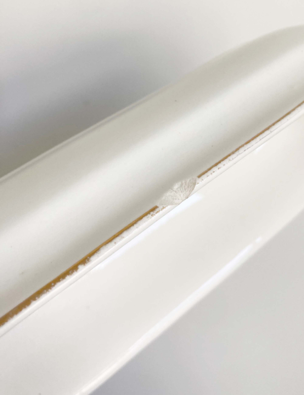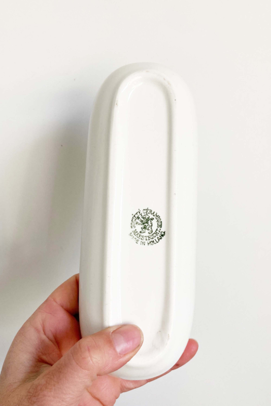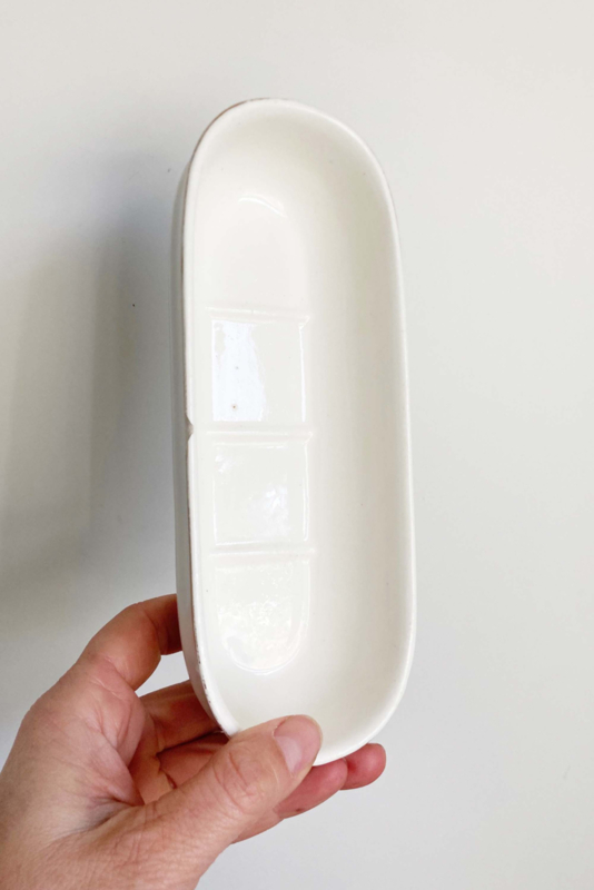 Dit vintage schaalte is gemaakt van aardewerk en was vermoedelijk bedoelt als kammen of zeepbakje.