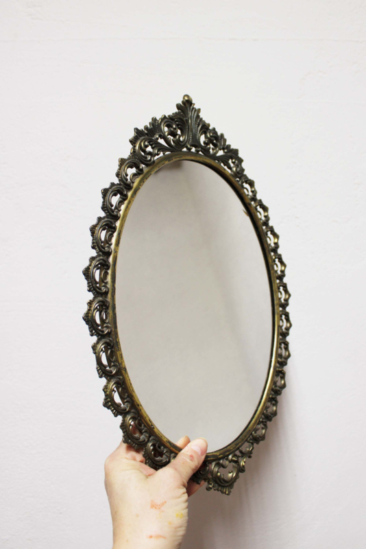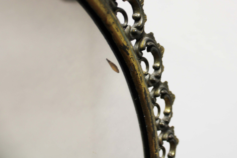 Vintage spiegel met bijzonere fraaie metalen rand, vermoedelijk brons en/of messing. Hier hebben al heel wat dames en heren een blik ingeworpen om te kijken of hun haar nog in model zat.