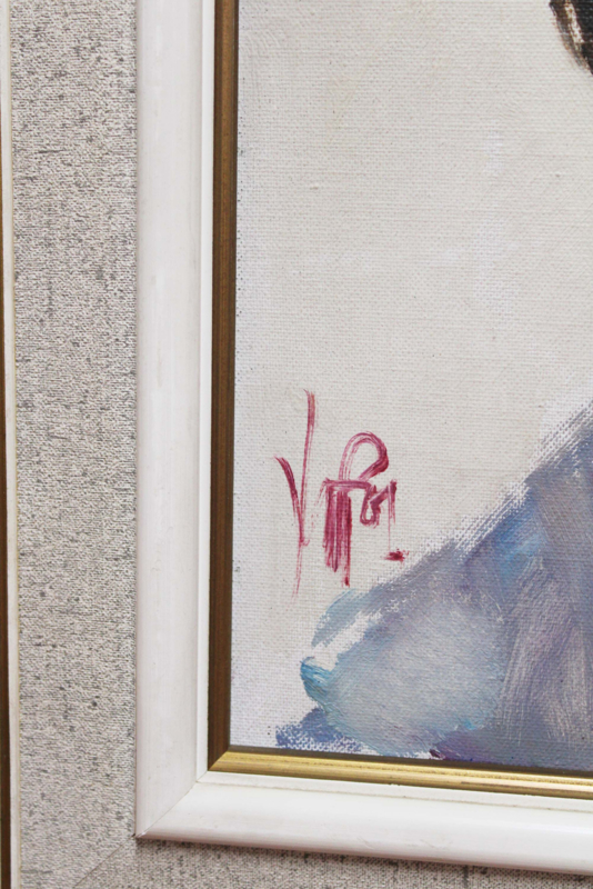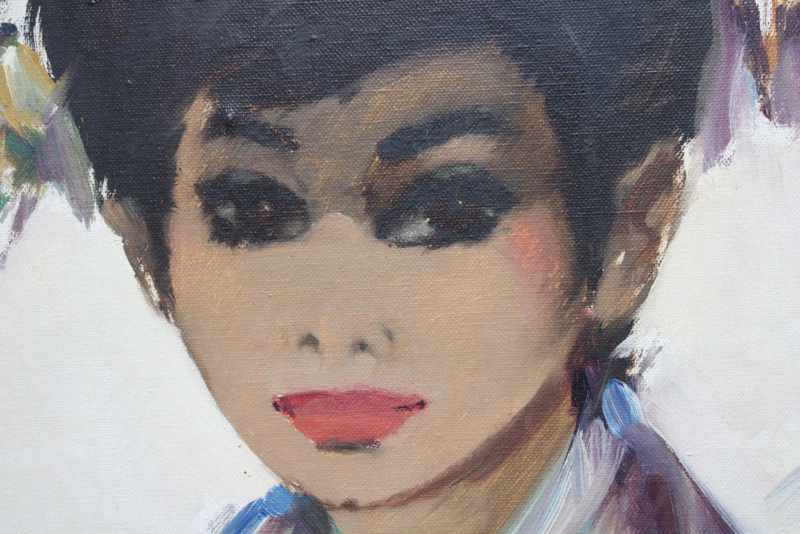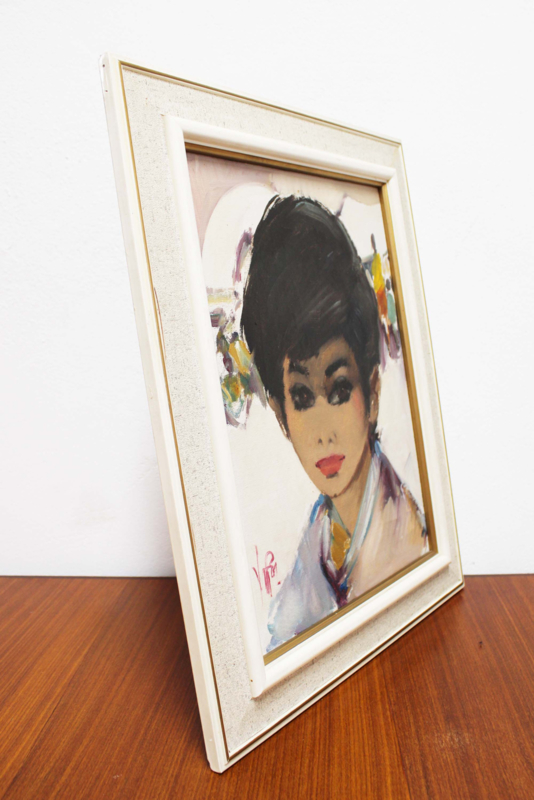 Afgebeeld is een portret van een vrouw met grote ogen. Vermoedelijk Willem Jilts Pol ( 1905 - 1988 ) maar of dat ook echt zo is durven we niet te garanderen, het is voor ons onleesbaar gesigneerd.