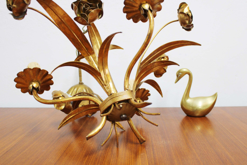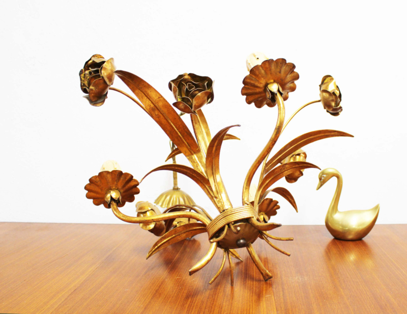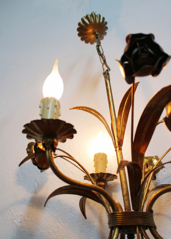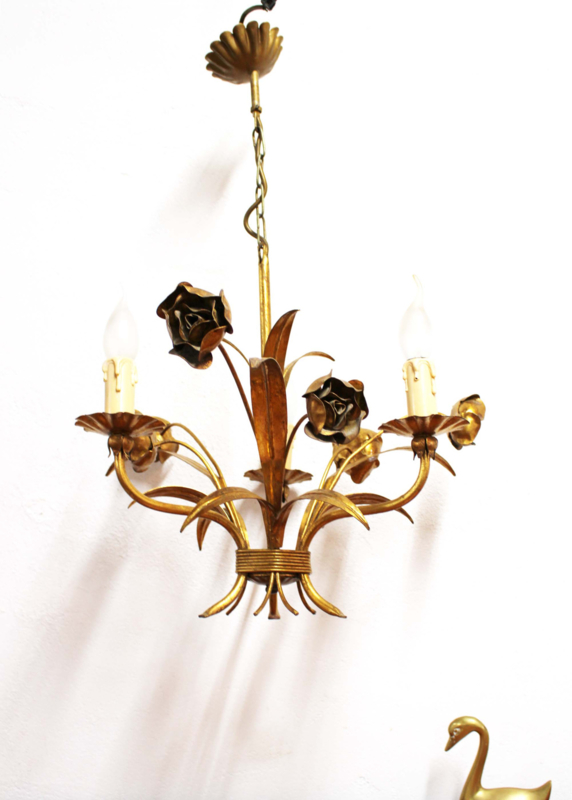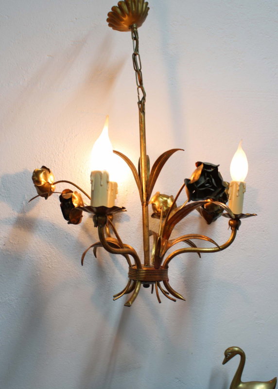Hollywood Regency lamp met rozen, Hans Kögl? Gouden vintage kroonluchter