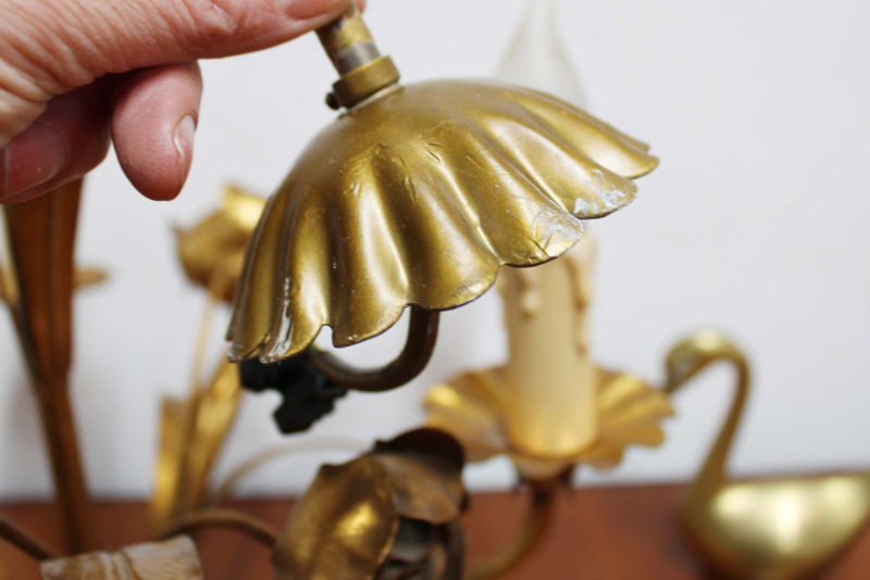 Deze Hollywood Regency lamp is gemaakt van goudkleurigmetaal en rijkelijk gedecoreerd met bloemetjes en bladeren. Doet denken aan Hans Kögl maar dat kunnen we niet garanderen.