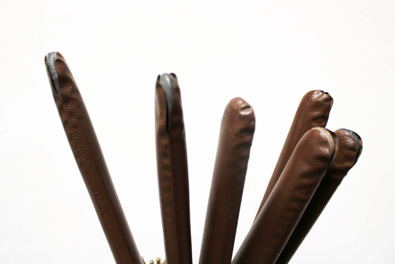 Set van 6 vintage kledinghangers bekleed met bruin skai leer.