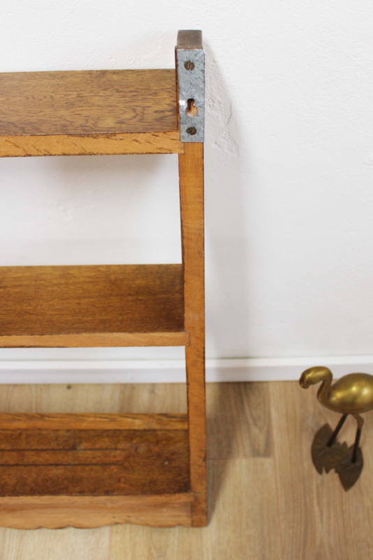 Het rek is gemaakt van hout en heeft onderaan metlaen haakjes. Dit item is in mooie vintage staat met normale gebruikssporen. Zie de foto's voor een goede indruk