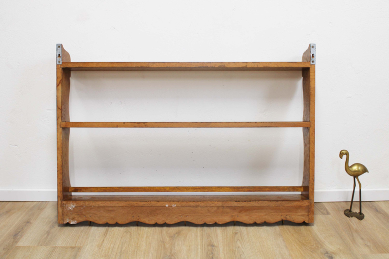 Houten vintage bordenrek met haken. Brocante rek voor aan de muur.
