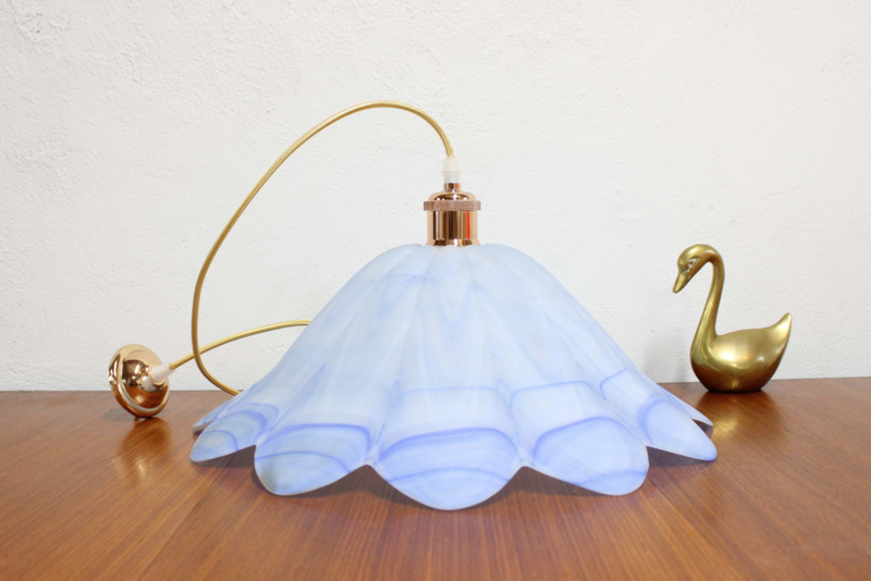 Blauw glazen vintage hanglamp. Prachtig als sfeerlamp in de slaapkamer of voor in de keuken of op het toilet bijvoorbeeld.