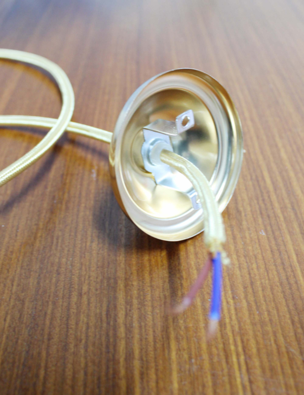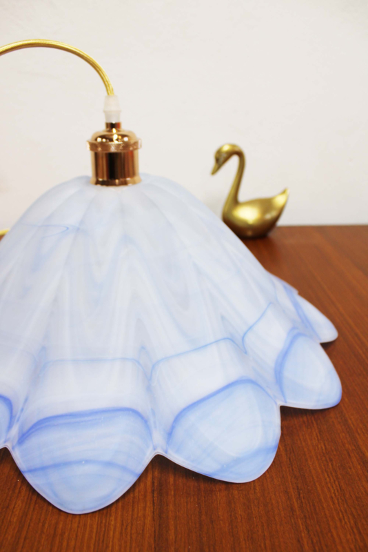 Deze retro lamp is gemaakt van blauw glas en heeft goudkleurige details aan het snoer (deze is niet origineel). Wie heeft hier het perfecte plekje voor?