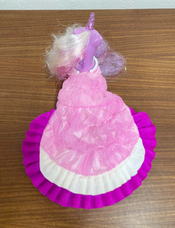 Dit retro speelgoed paardje heeft een prachtige jurk aan en is gezien de leeftijd in mooie staat met normale gebruikssporen, de ogen kunnen knipperen. Eventuele verlichting is niet getest, zie foto's.