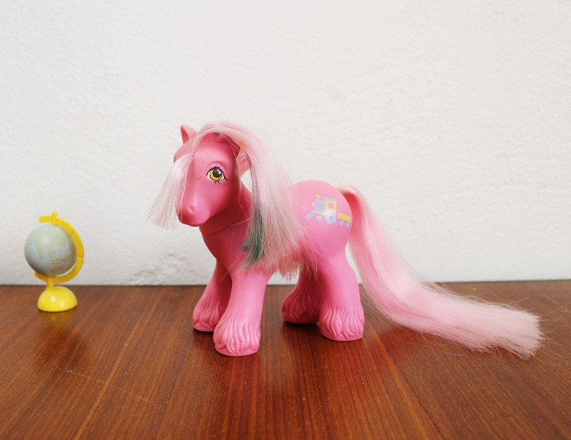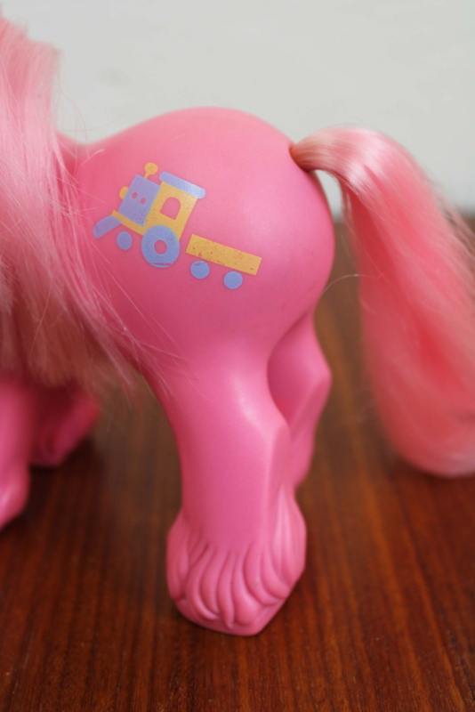 Dit roze retro speelgoed paardje met trein als cutie mark op het lichaam is gezien de leeftijd nog in mooie staat met wat gebruikssporen. Zie foto's voor een goede impressie.