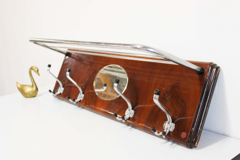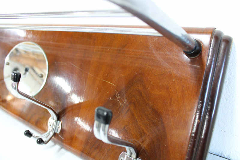 Houten vintage kapstok met spiegeltje. Retro Mid Century wandkapstok