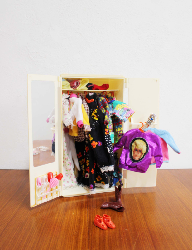Deze retro speelgoed kast is gevuld met kleding waaronder de Barbie & The Rockers Concert Tour trui, bruine cowboy laarzen, wat schoenen, kleerhangers en vele accessoires