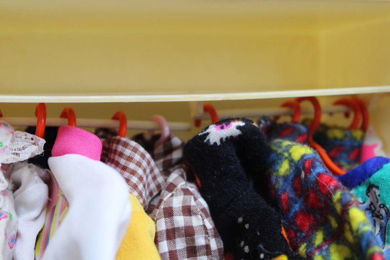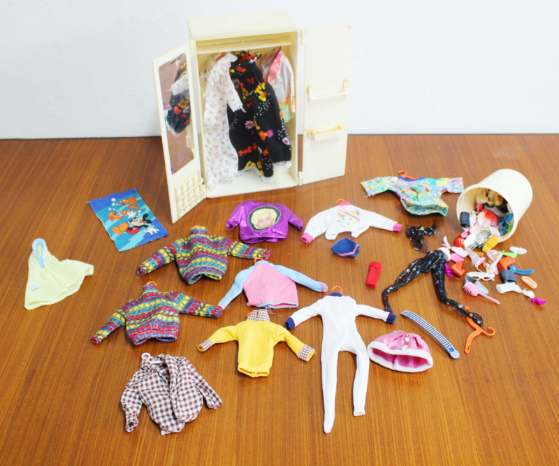 Vintage kledingkast voor Sindy (of Barbie) met inhoud. Retro speelgoed kast