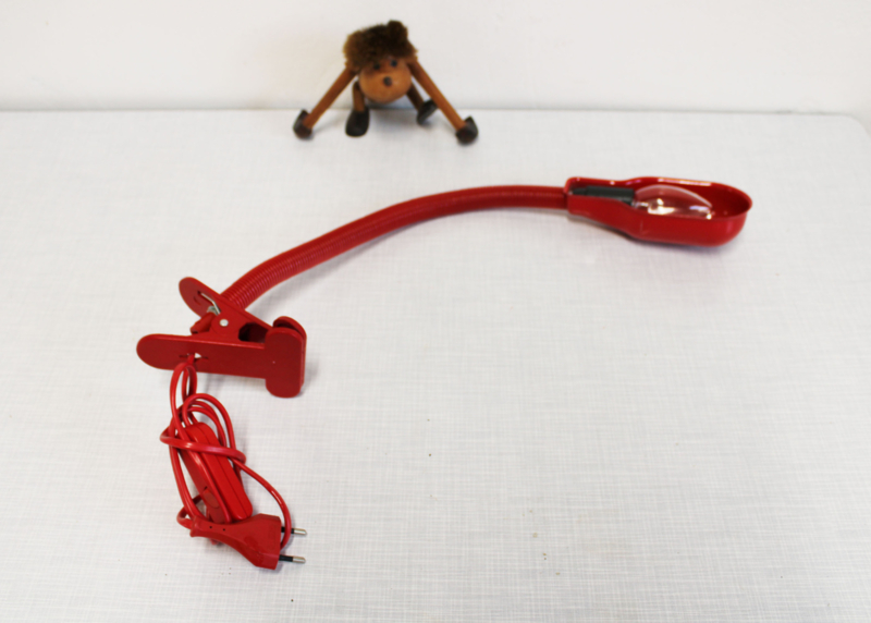 Rode vintage klemlamp met buigbare arm.
