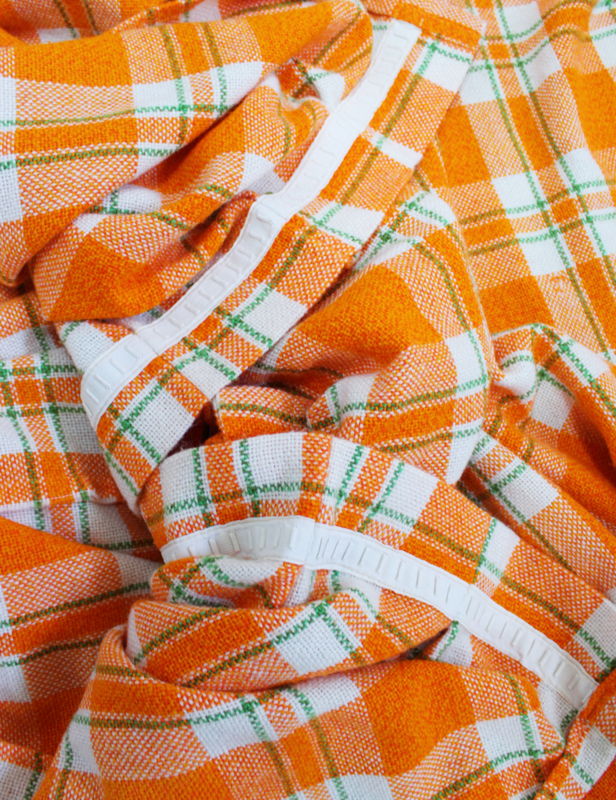 Set vintage gordijnen uit de jaren 70 van de vorige eeuw. De stof heeft een ruitjes patroon in oranje en wit.