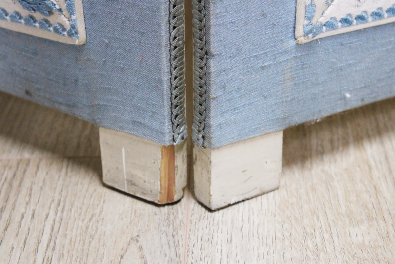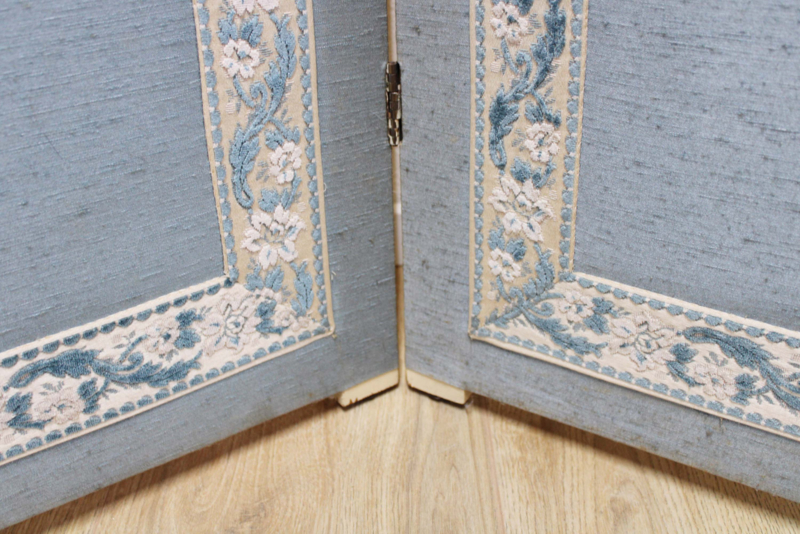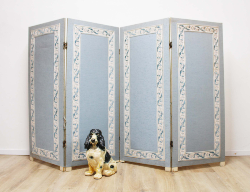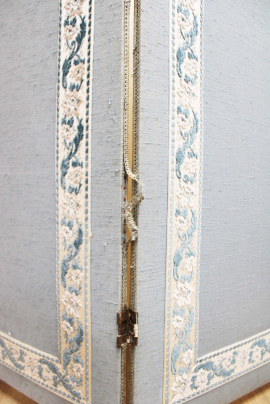Antiek 4-delig kamerscherm met lichtblauwe stof.