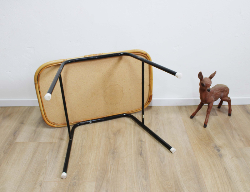 Dit retro tafeltje is vermoedelijk van Rohe en had waarschijnlijk een glazen blad. Deze is vervangen door een houten exemplaar en beplakt met een plastic laagje, deze heeft wel wat gebruikssporen, zie foto's
