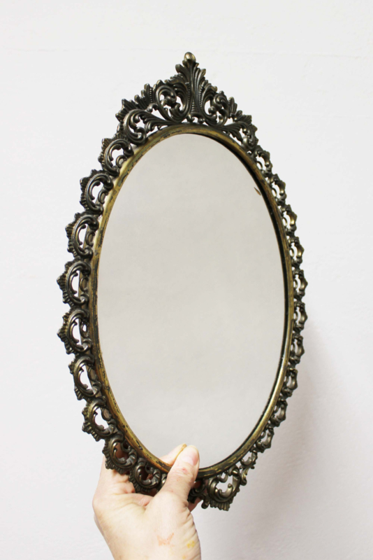 Vintage spiegel met bijzonere fraaie metalen rand, vermoedelijk brons en/of messing. Hier hebben al heel wat dames en heren een blik ingeworpen om te kijken of hun haar nog in model zat.