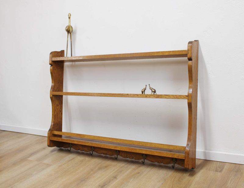 Houten vintage bordenrek met haken. Brocante rek voor aan de muur.Houten vintage wandrek met goudkleurige haakjes onderaan.