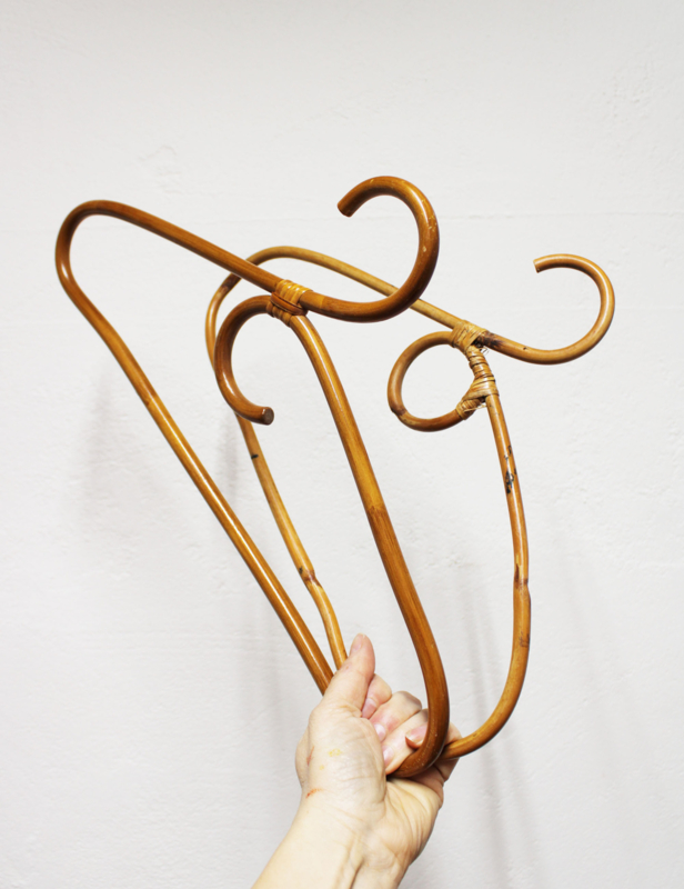 2 rotan vintage kledinghangers. Set retro kleerhanger / bamboe kapstokSet vintage kledinghangers gemaakt van rotan/ bamboe. Leuk voor in een Bohemien slaapkamer of bijvoorbeeld.