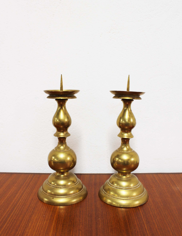 Set goudkleurige vintage kandelaars. Twee messing (?) kaarsen houdersSet vintage kandelaars van goudkleurig metaal, vermoedelijk messing en/of koper.