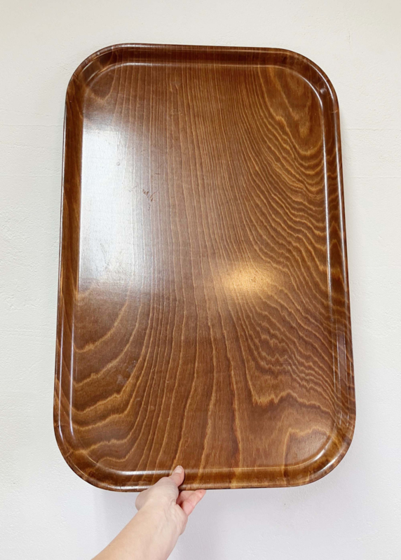 XXL Vintage dienblad met hout decor. Groot retro presenteerbladGroot vintage dienblad met hout patroon.