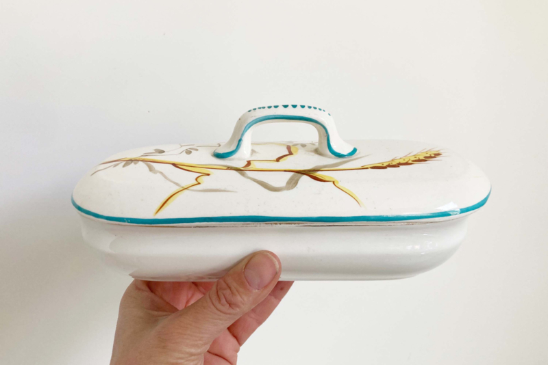 Antiek aardewerk zeep/kammen bakje - Société Céramique Maastricht. Vintage schaaltje met deksel.Antiek keramieken bakje met deksel van Société Céramique Maastricht.